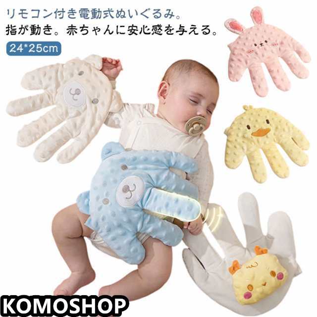 | リモコン付き電動式ぬいぐるみ。指が動き。赤ちゃんに安心感を与える。 寝かしつけで大切なのは『安心感』!寝ている時に赤ちゃんに手の触るような安心感を与えます。 指が動き!リモコンでぬいぐるみをコントローラーで、ベビーの寝かしつけになってくれます。 ※中身の物だけ加熱できますので、カバーを外して電子レンジで1分に加熱ください。 柔らかい素材。抱きしめやすい形と、思わず触りたくなるフワフワな触り心地が赤ちゃんをリラックスさせます。 いつでも清潔に!洗濯機で洗濯可能だからいつでも清潔に保つことができます。 | |