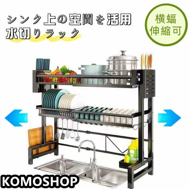 水切りラック 水切りかご 大容量 シンク上 2段 左右伸縮 おしゃれ キッチン コンパクトシンク上 ラック 箸立て まな板立て 包丁立てバスケットフック 幅62?100