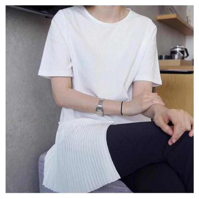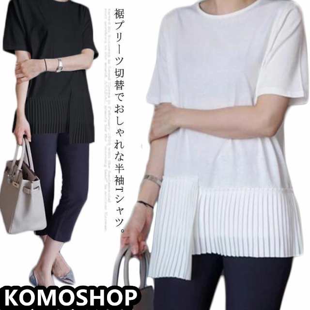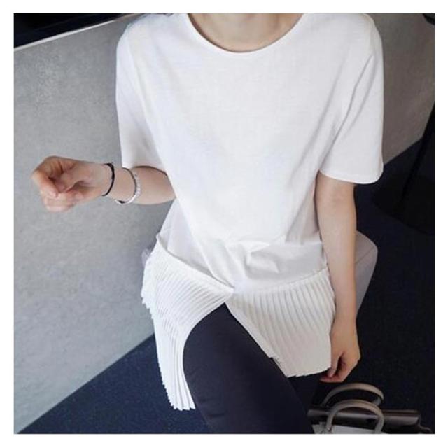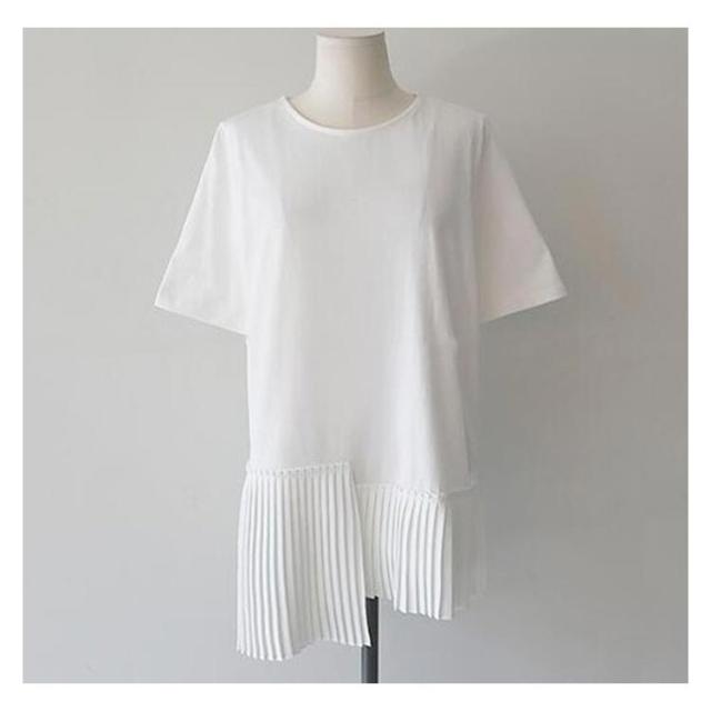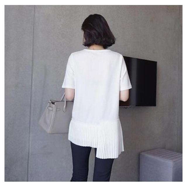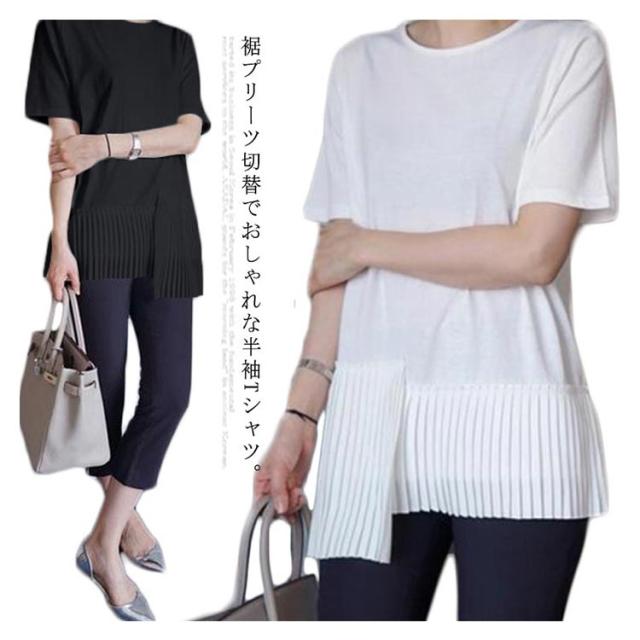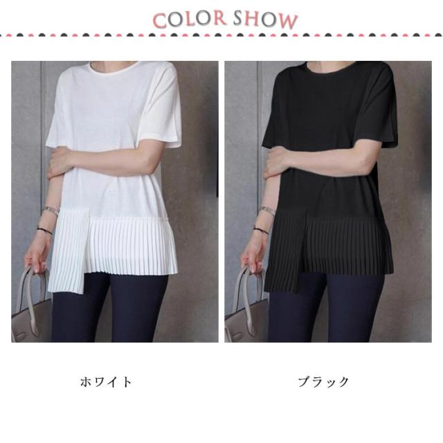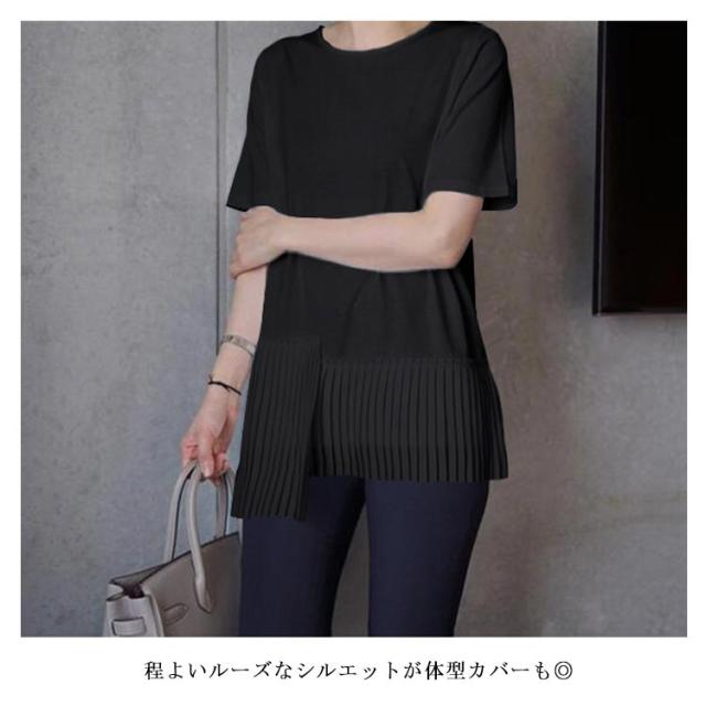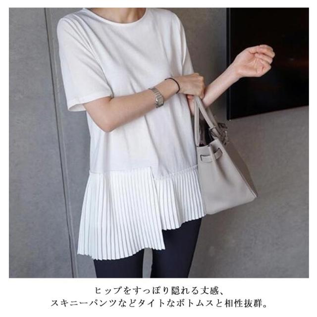 半袖 おしゃれ プリーツ 送料無料 Tシャツ レディース 半袖Tシャツ 可愛い 切り替え 個性的 クルーネック アシンメトリー トップス カットソー 半袖