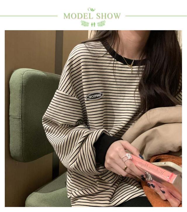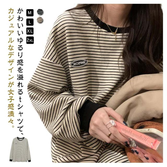 カットソー Tシャツ 長袖 秋 スウェット トップス ロンT トレーナー おしゃれ 大きいサイズ クルーネック ボーダー 丸首 冬 シンプル 春 プルオーバー トップス 部屋着 Tシャツ カジュアル 黒 ベージュ ブラック
