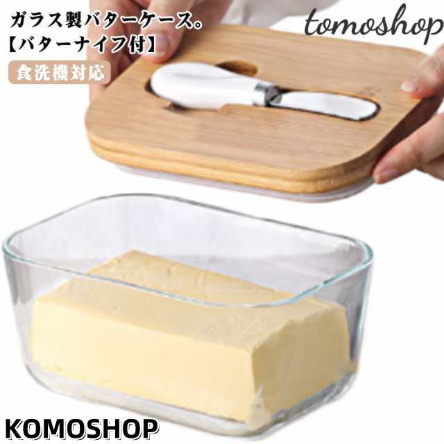 | ガラス製バターケース。【バターナイフ付】 木製蓋にはにおい移りや乾燥を防ぐパッキン付き 蓋に収納できるステンレスバターナイフ付き シンプルながらも洗練されたデザインと実用性を兼ね備えたバターケースです。 | |
