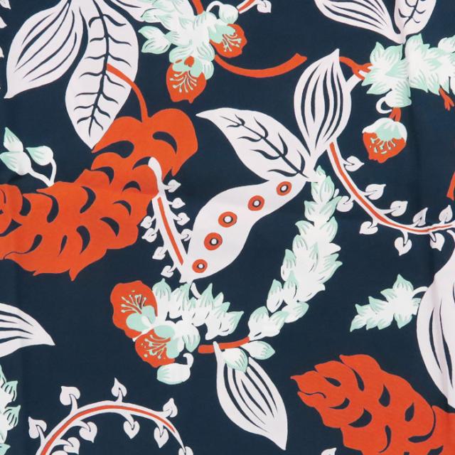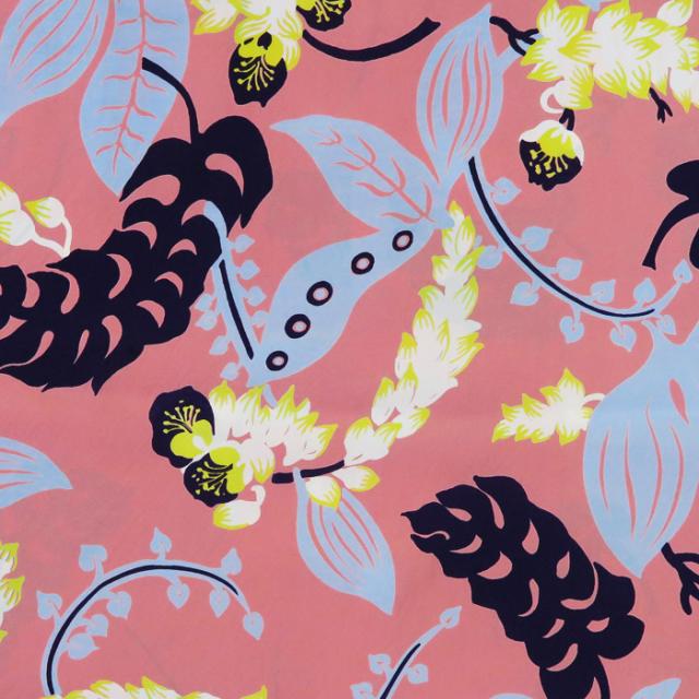 抜染のプリント技法により鮮やかに描き出されたシェルジンジャーの花穂と葉が印象的な一枚。