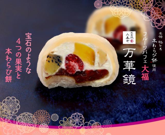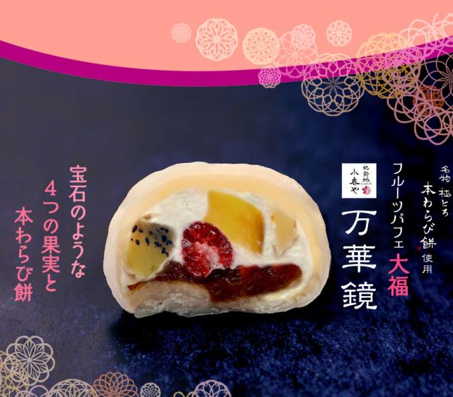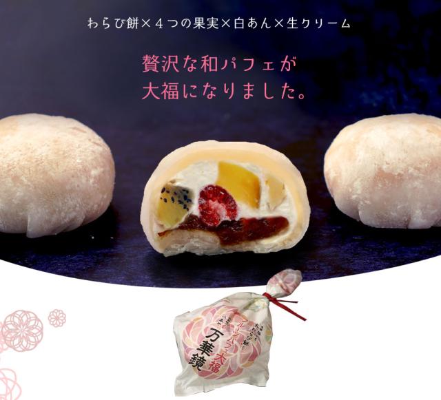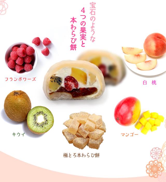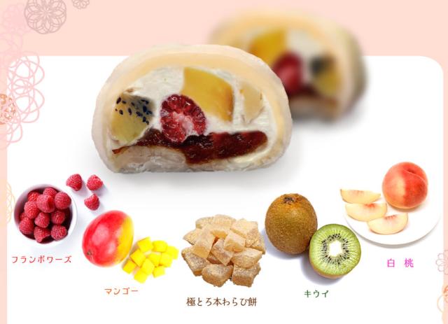 雑誌やテレビでも話題!もちもちとやわらかい大福の中には4つのゴロッと果実と、本わらび餅を白餡と生クリームと一緒に包みこみました。フルーツパフェを大福に詰め込みました。