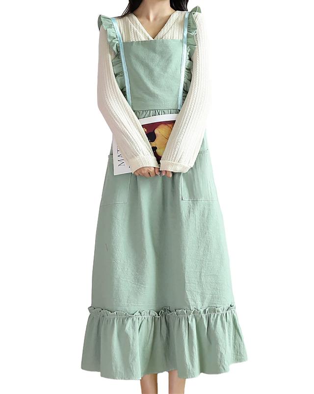 TOWYYO エプロン レディース かわいい おしゃれ フリル ポケット付き 肩掛け キッチン カフェ風 料理教室 綿 ロング丈 無地 北欧風 ワ