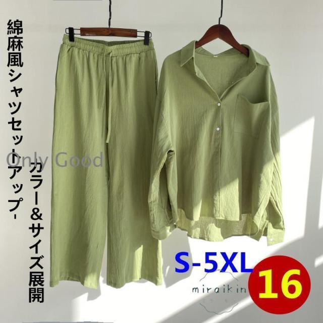 リネンシャツ レディース 長袖 リネンパンツ ワイドパンツ ゆったりトップス 綿麻風 セットアップ 春秋 夏秋物 無地 ボトムス 前開き ウエストゴム ボタン