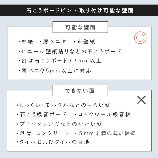 ■取り付け可能な壁:石こうボードピン使用時/壁紙・布壁紙・ビニール壁紙貼りなどの石こうボード・薄ベニヤ、木ネジ使用時/柱・板壁(厚さ1cm以上)・プリント合板(裏側に水平にサンがある場所)・裏側に下地材(間柱)が入っている壁