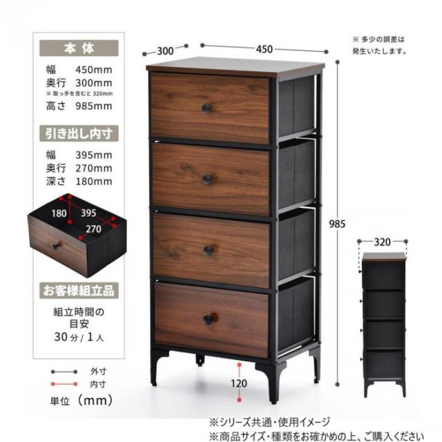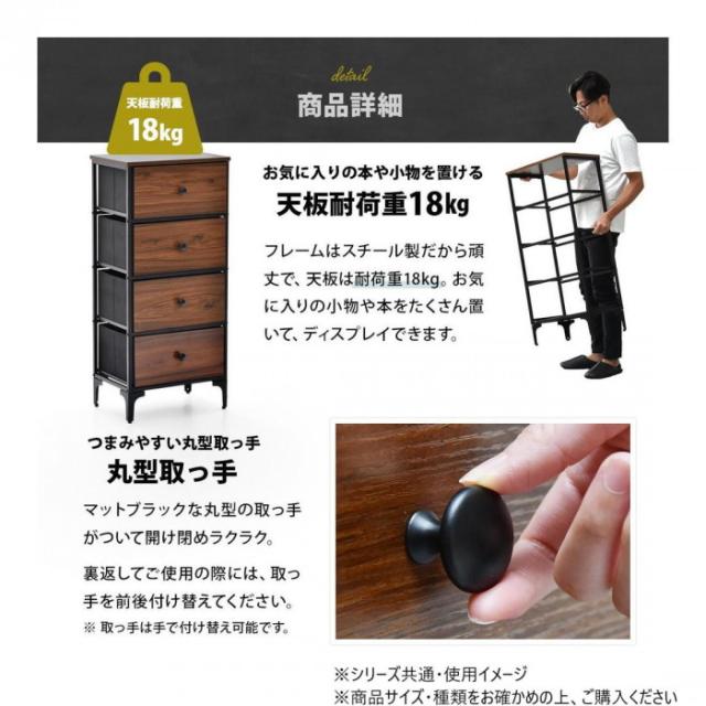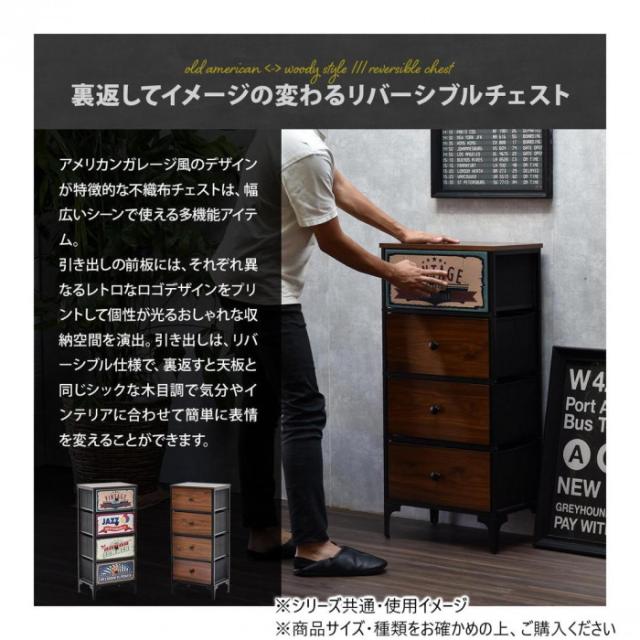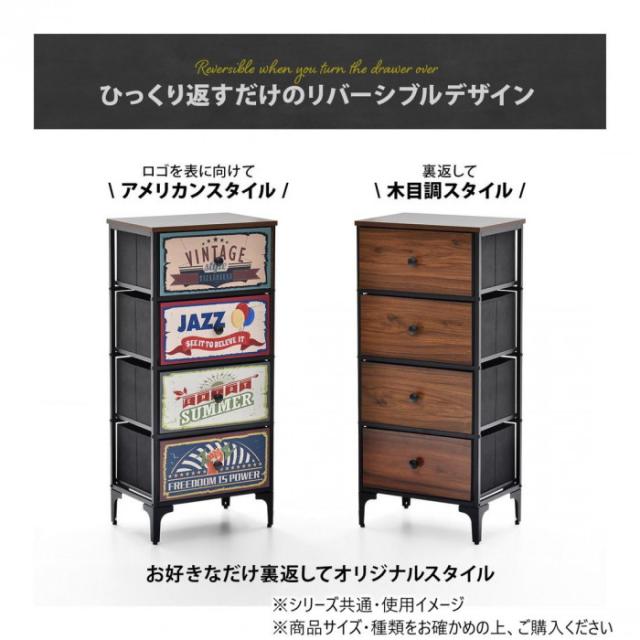 商品詳細:アメリカンヴィンテージの雰囲気がおしゃれな、リバーシブル収納チェスト。収納はリバーシブルタイプで片方はヴィンテージデザイン、もう一方はブラウンの木目調デザインとなっており、お部屋の雰囲気に合わせて変えることが出来ます。 生産国:中国 素材・材質:天板:中質繊維板(メラミン貼り)背板、引き出し後ろ板:中質繊維板(PVC貼り)フレーム:スチールパイプ引出し:不織布 ポリエステル(芯材)MDF、紙取っ手:PP 商品サイズ:幅450×奥行300×高さ985mm 重量:約9.1kg 仕様:粉体塗装耐荷重(天板):約18kg組立(1人):約30分