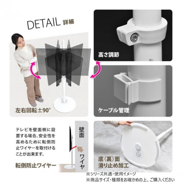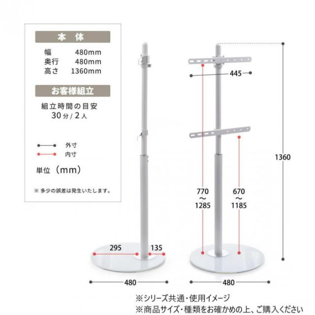 商品詳細:32~65型までのテレビに対応した、本体耐荷重40kgのテレビスタンド。首振り機能がついているので左右90度で角度が変えれますので、お好みの角度でテレビをご覧いただけます。スタイリッシュでモダンなデザインなので、設置するだけでお部屋の雰囲気をおしゃれに変えられます。 生産国:中国 素材・材質:支柱:スチール底板:強化ガラス 商品サイズ:幅480×奥行480×高さ1360mm 重量:約7kg 仕様:粉体塗装強化ガラス:8mm耐荷重:40kg組立(2人):約30分