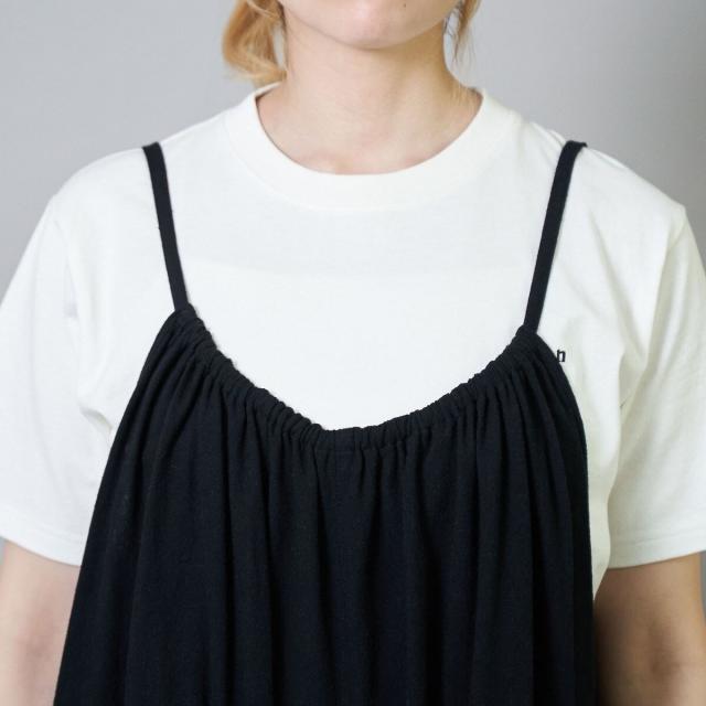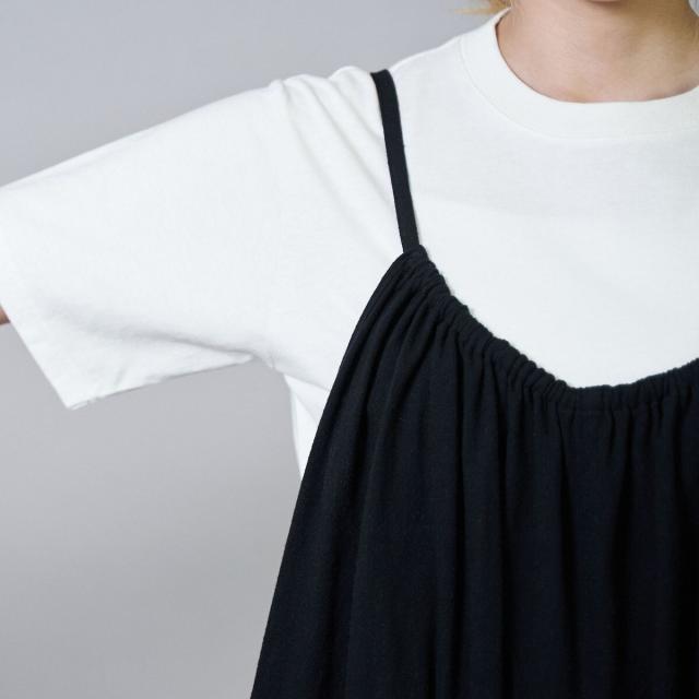 胸元に施したギャザーと、華奢なストラップでフェミニンな印象に。