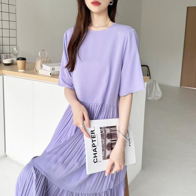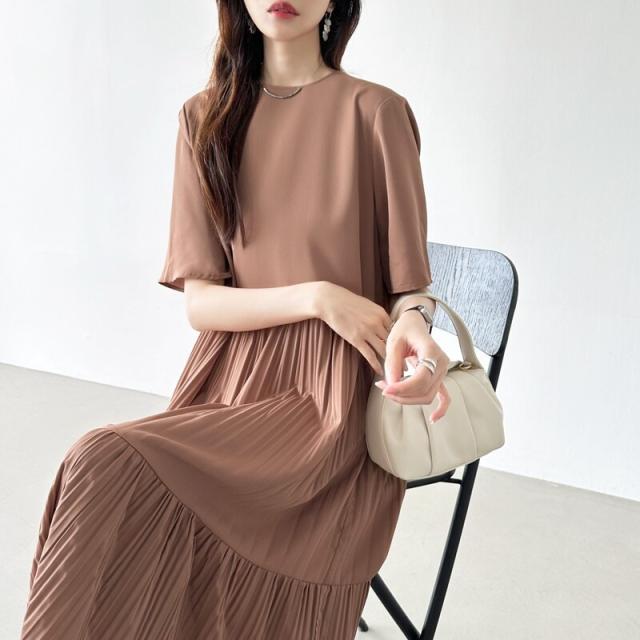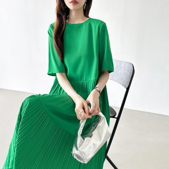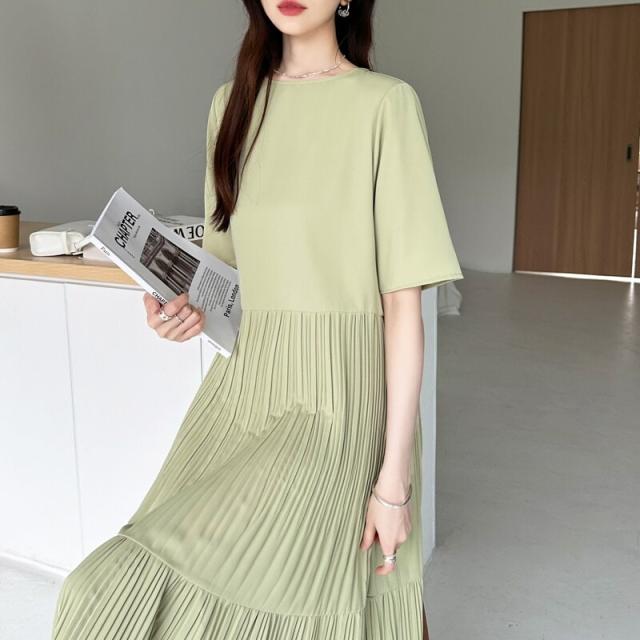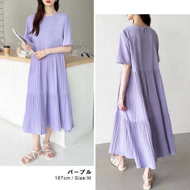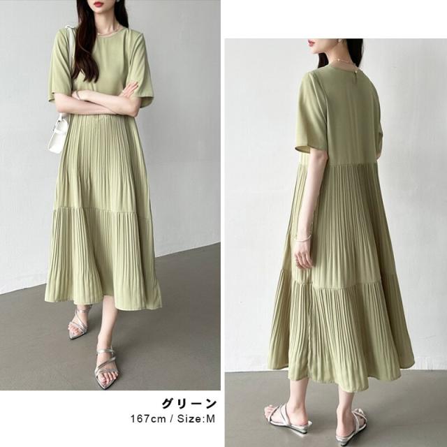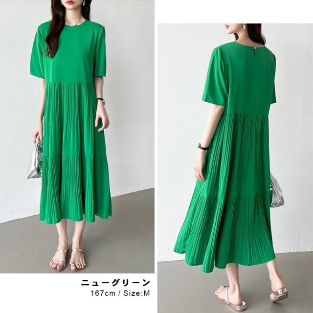 フレアワンピース ロング丈 半袖 ギャザーワンピース 夏 レディース クルーネック ゆったり