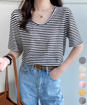 ボーダー柄Tシャツ レディース 半袖夏服 ラウンドネック 配
