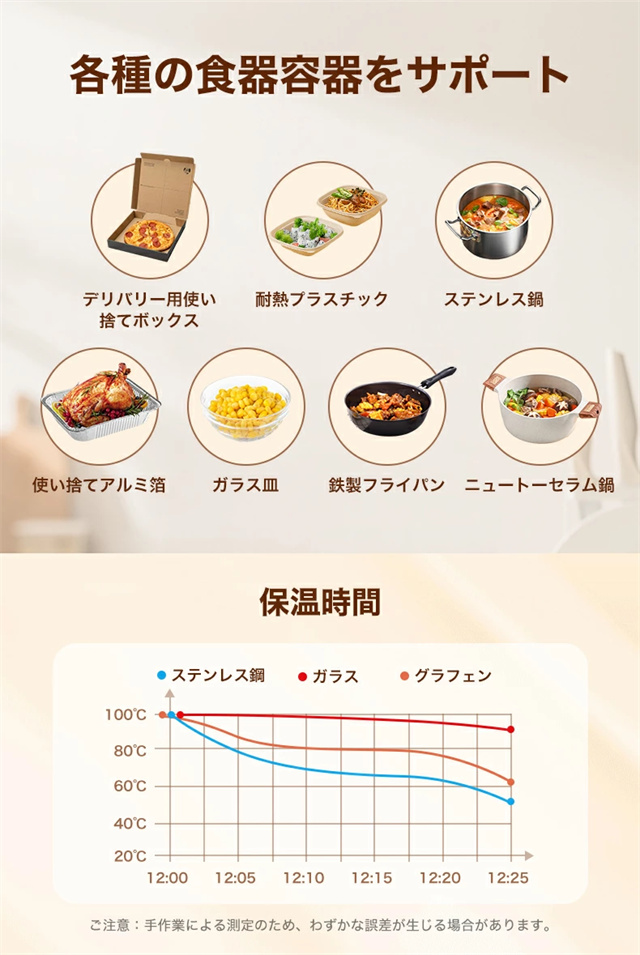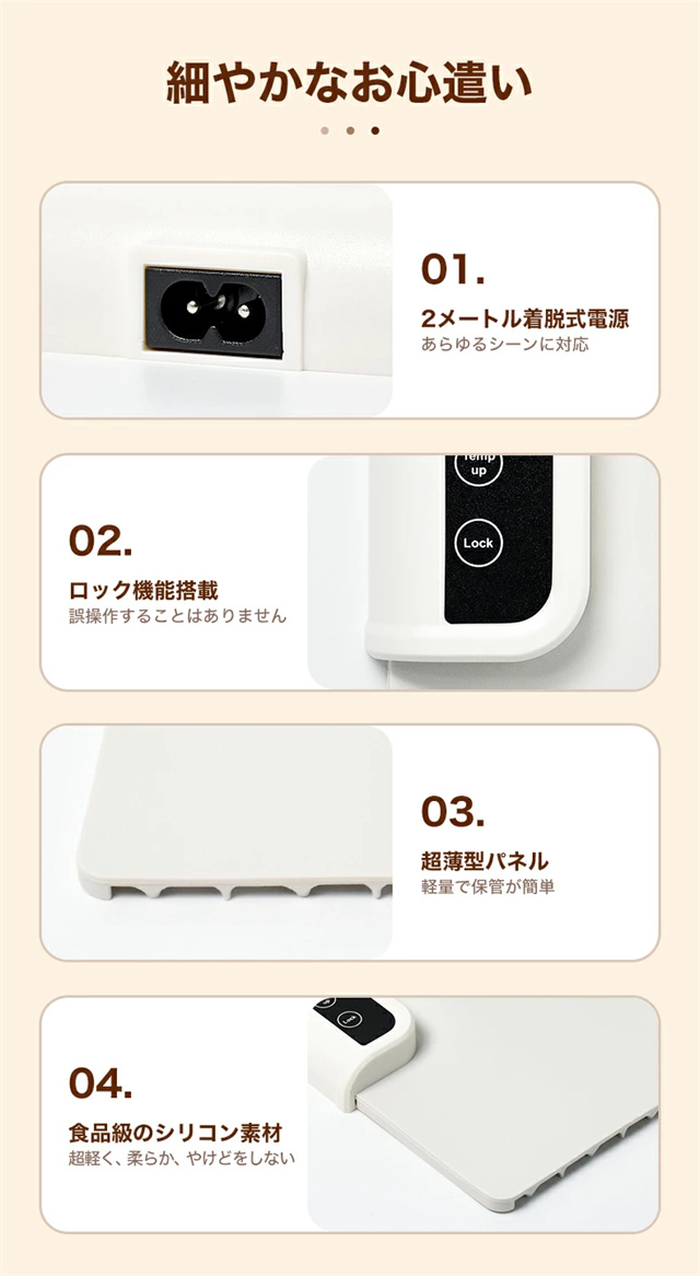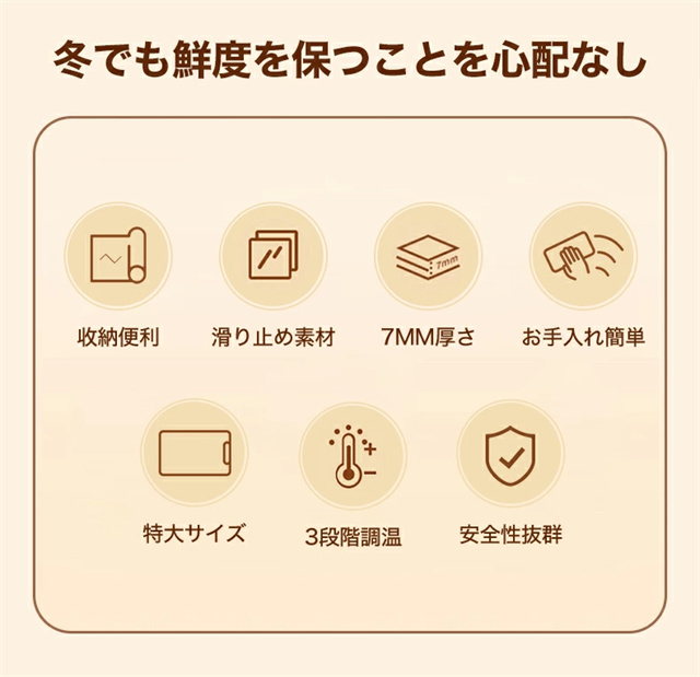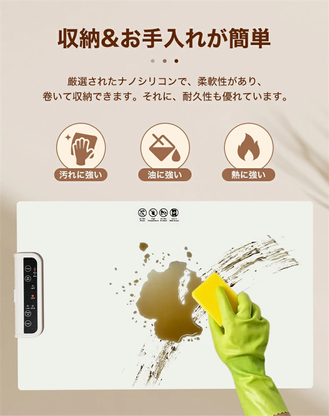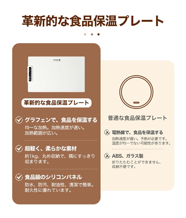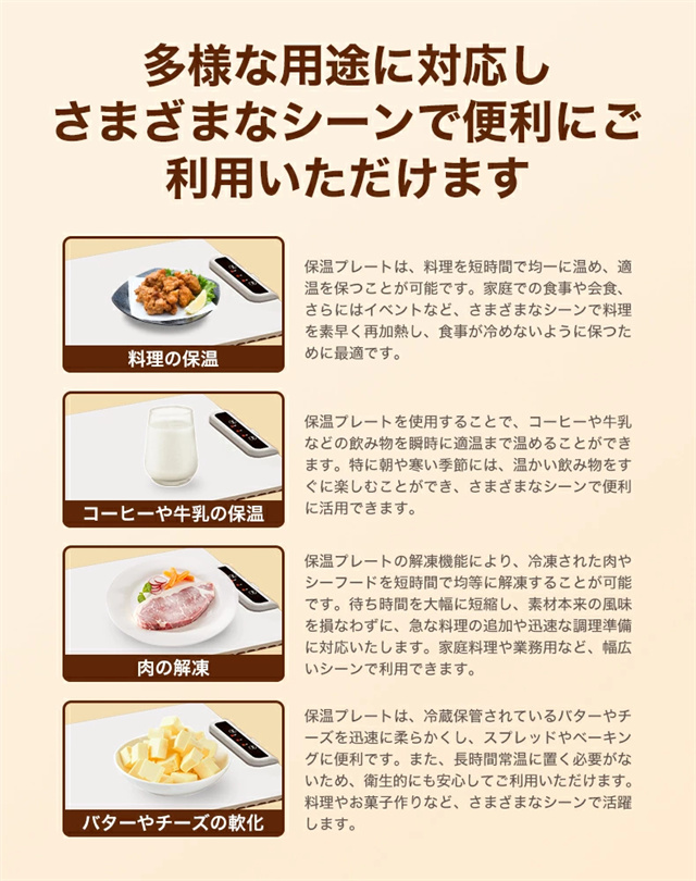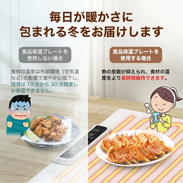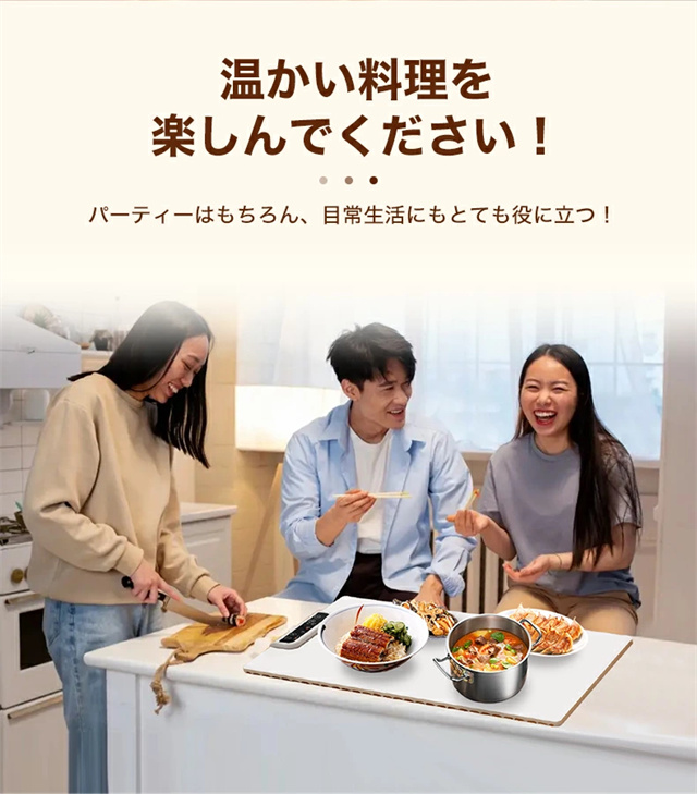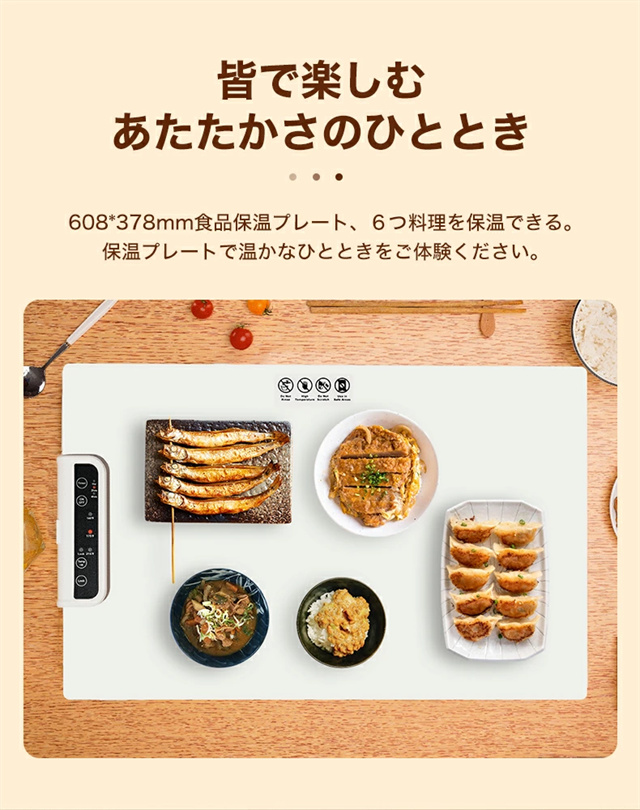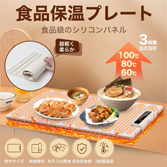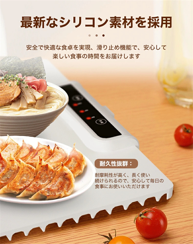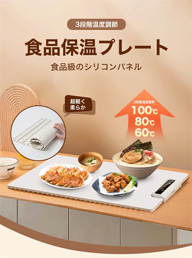 1.大面積加熱:優れた加熱技術と大面積電熱線設計を使用したこの食品温めトレイは、均一な熱分布と急速加熱を保証し、食事を自由に配置し、冷却を避けることができます。 2。多用途: この保温プレートは、食品温めマットとしての機能に加えて、牛乳の加熱、食品の解凍、特定のアイテムの乾燥にも適しています。家庭のキッチンに欠かせない、調理の利便性を提供します。 3. 0.7CMの薄型パネル:この電動トレイは展開時の厚さがわずか0.7cmで、柔軟に丸めることができ、整理が簡単です。防水?防油コーティングも施されており、メンテナンスが簡単で、機能的でコンパクトなヒーティングマットの利点を享受できます。 4. 3段階温度設定:温度範囲は60?100℃、3段階調節可能です。わずか 10 秒で急速加熱できる便利さをお楽しみください。食べ物を長時間温かく美味しく保ち、食事体験を向上させます。 5.安全で持ち運びに便利:この電気保温トレイは軽量なボディで、丸めたり折りたたんだりでき、保管や持ち運びが簡単です。滑り止めシリコンマットは摩擦を増加させ、滑りや転倒を防ぎ、パーティー、ビュッフェ、集まり、日常の使用に適しています |