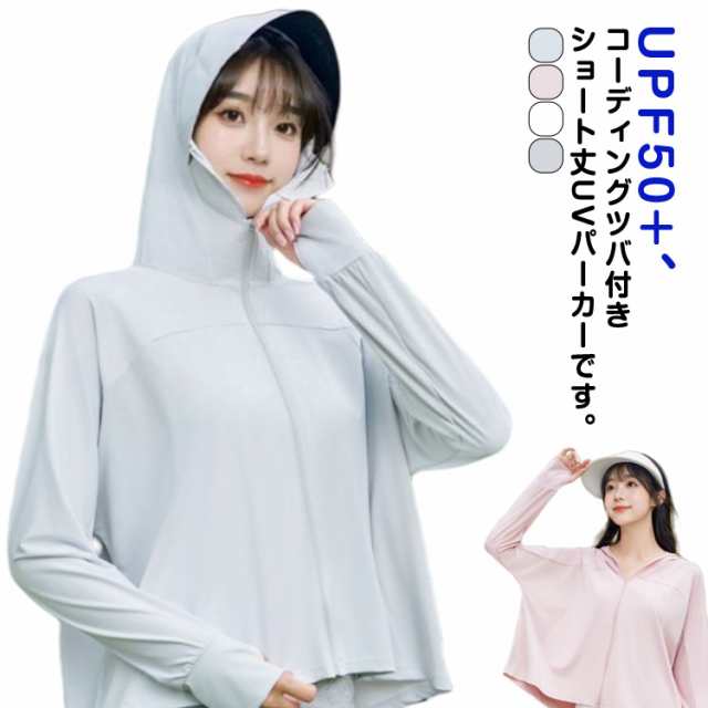 UPF50+ uvパーカー レディース 接触冷感 UV パーカー フェイスカバー ショート丈 コーディングつば 長袖 ラッシュガード アウター 指穴 薄手 日焼け防止 紫外線対策 ブルー ホワイト グレー ピンク