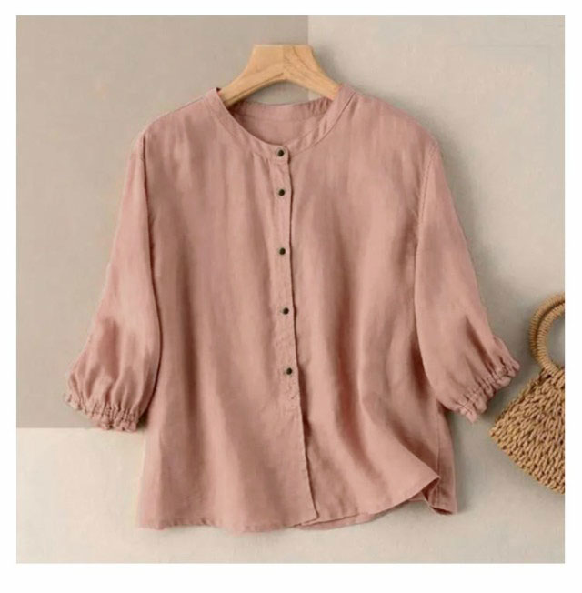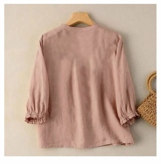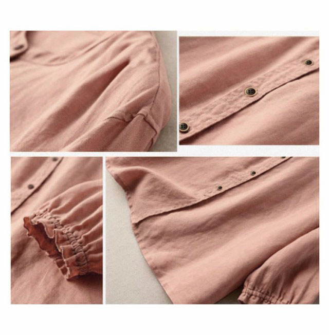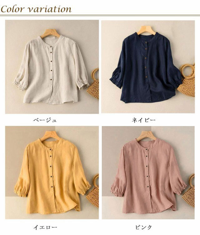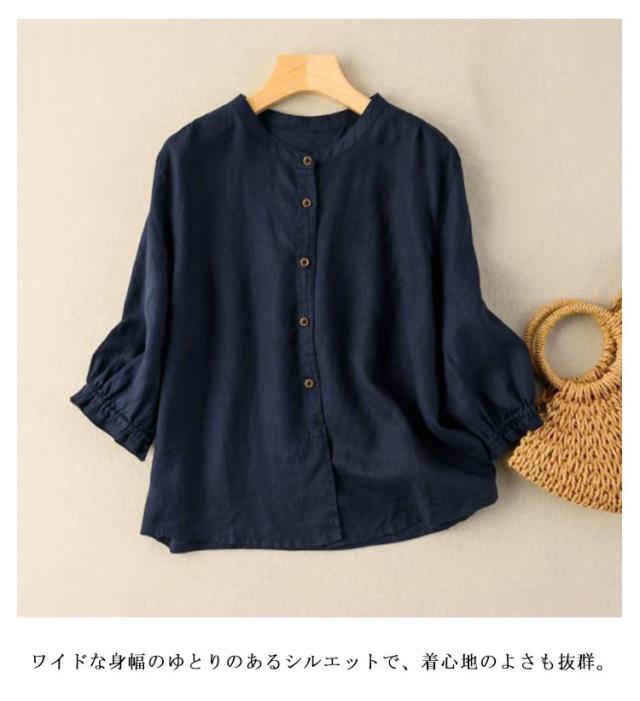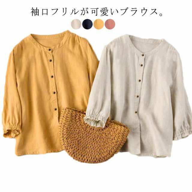 ブラウス リネン 綿麻 シャツ レディース 七分袖 リネンブラウス 前開き 春夏 スタンドカラー トップス フリル袖 ナチュラル キレイめ 無地 おしゃれ ゆったり かわいい 大きいサイズ 大人