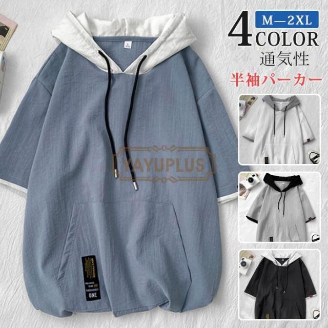 半袖パーカー メンズ パーカー フード付き 韓国風 おしゃれ ポケット 夏 夏パーカー プルオーバー スポーツ 五分袖 薄手 涼しい ひんやり