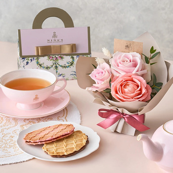 白とピンクの可愛らしいバラブーケと、艶めくシロップ漬けやセミドライの果実がジュエリーのようなカップケーキをセットにしました。