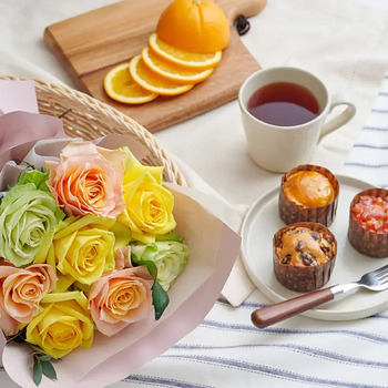 清々しいビタミンカラーのバラブーケと、艶めくシロップ漬けやセミドライの果実がジュエリーのようなカップケーキをセットにしました。