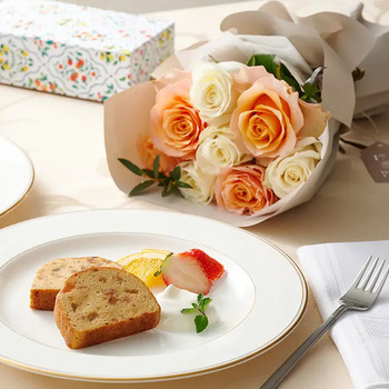 爽やかなコントラストが印象的なバラブーケと、フルーツを味わえるデザート感覚のパウンドケーキをセットしました。