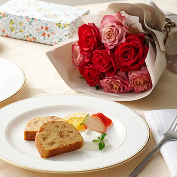 商品内容:バラ(サムライ、テナチュール)×8本、パウンドケーキ×4個、栄養剤10ml(50倍希釈タイプ)、お手入れのしおり付き