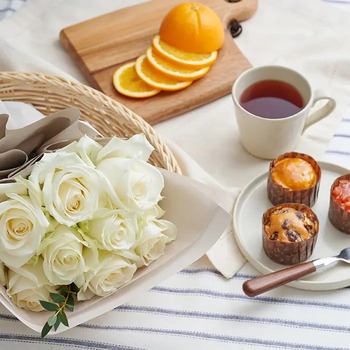 清楚な白バラブーケと、艶めくシロップ漬けやセミドライの果実がジュエリーのようなカップケーキをセットにしました。