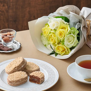 商品内容:お任せバラ(白黄色系)×8本、アーモンドショコラサンド×4個、栄養剤10ml(50倍希釈タイプ)、お手入れのしおり付き
