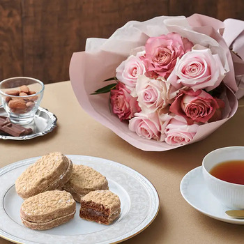 新鮮な摘みたてバラのブーケに、さっくりとした食感とともに、ショコラの風味豊かなクリームを楽しめるダックワーズを添えてお届けします。