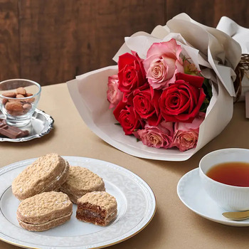 新鮮な摘みたてバラのブーケに、さっくりとした食感とともに、ショコラの風味豊かなクリームを楽しめるダックワーズを添えてお届けします。