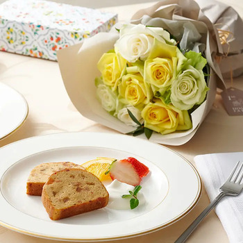 新鮮な摘みたてバラのブーケに、さっくりとした食感とともに、ショコラの風味豊かなクリームを楽しめるダックワーズを添えてお届けします。