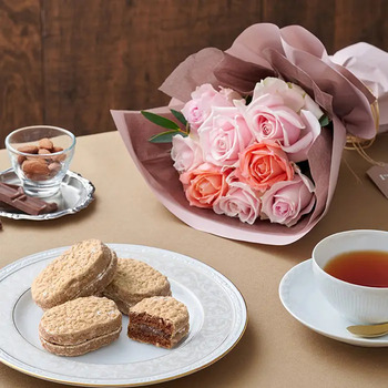 新鮮な摘みたてバラのブーケに、さっくりとした食感とともに、ショコラの風味豊かなクリームを楽しめるダックワーズを添えてお届けします。