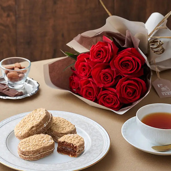 新鮮な摘みたてバラのブーケに、さっくりとした食感とともに、ショコラの風味豊かなクリームを楽しめるダックワーズを添えてお届けします。