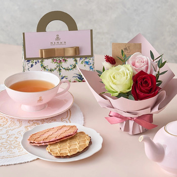 商品内容:ミニアレンジメント カラフル×1、ロイヤル シークレット ガーデン(ニナス オリジナル マリー・アントワネット ティー×1袋)、ワッフルチョコレートサンドクッキー(プレーン・ストロベリー×各1枚)、お手入れのしおり付き