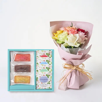 ホシファームのバラブーケと華やかなフィナンシェとウェッジウッドの紅茶のコンビギフトです。