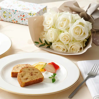 お部屋を彩る新鮮なバラのミニアレンジメントと、フランスの老舗紅茶ブランド「ニナス マリー・アントワネット」の世界観で、時を超えたロイヤル・ティータイムをお届けします。