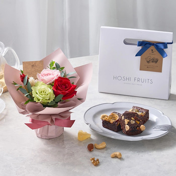 濃厚なチョコレートの生地に、香ばしいナッツや甘酸っぱいフルーツをトッピングした贅沢ブラウニー3個と、その時おすすめのバラを使ったミニアレンジメントをセットにしてお届けします。