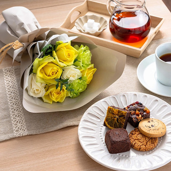 商品内容:おまかせバラ(イエロー・グリーン・白系)×8本、レーズンクッキー・チョコチップクッキー・ブラウニーネーブル・ブラウニードライフルーツ&ナッツ・チョコレートケーキ×各1個、栄養剤10ml(50倍希釈タイプ)、お手入れのしおり付き