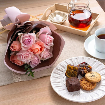 商品内容:お任せバラ(ピンク系)×8本、レーズンクッキー・チョコチップクッキー・ブラウニーネーブル・ブラウニードライフルーツ&ナッツ・チョコレートケーキ×各1個、栄養剤10ml(50倍希釈タイプ)、お手入れのしおり付き