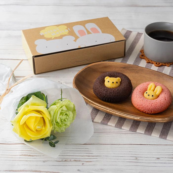 瑞々しい空間をつくり出すビタミンカラーのバラ2本と、真ん中から動物たちがひょっこり顔を出した焼きドーナツを可愛らしい箱に一緒に入れてお届けします。