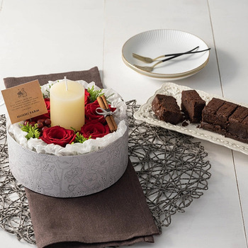 商品内容:アレンジメント×1、キャンドル付き、ショコラケーキ1本(6切れ)、お手入れのしおり付き