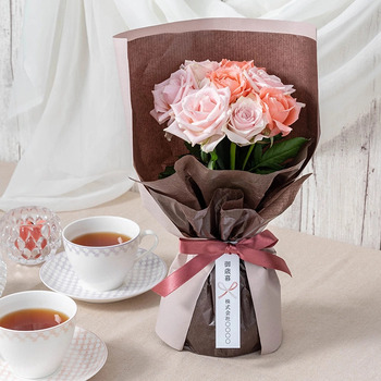 摘みたてのバラの中から、ギフトに最適なピンク系のバラを選定し組み合わせた、優しい印象のおまかせバラのスタンディングブーケです。