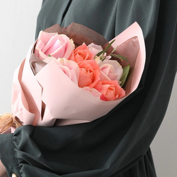 商品内容:お任せバラ(ピンク系)×8本、栄養剤10ml(50倍希釈タイプ)、お手入れのしおり付き ※ピンク系の品種より選定し組み合わせます。
