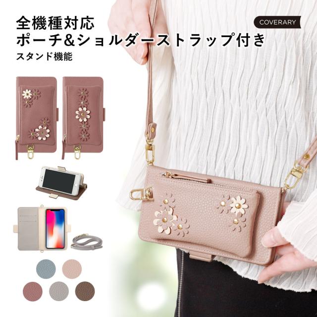 ポーチ&ショルダーストラップ付き手帳型ケース全5色×選べるフラワーモチーフ