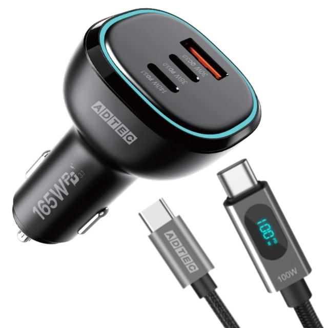 アドテック シガーソケット PD3.1充電器 165W 3ポート 【USB-Cx2+USB-A】【ワットモニタ/100W/eMarker】Type-Cケーブル付属 カーチャー