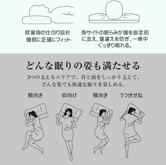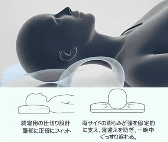 頸椎サポート安眠枕は頸椎にぴったりとフィットし、睡眠時の負担を激減。 頭が枕におさまって、ゆったり快適。