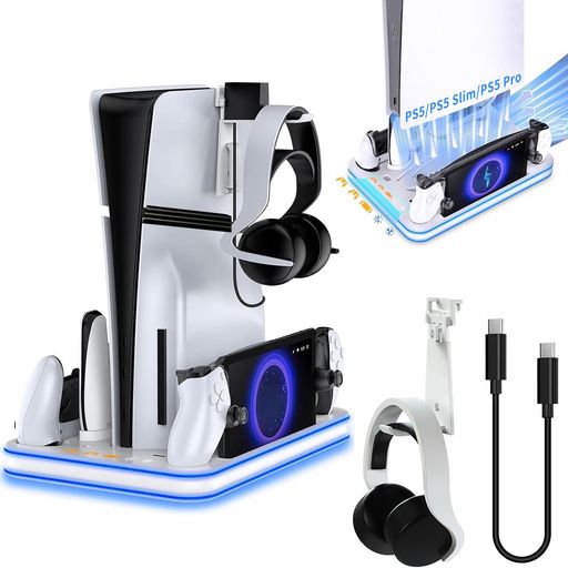 PS5 PRO/PS5 SLIM/PS5対応 縦置きスタンド 【新登場5-IN-1】PS5 コントローラー 充電スタンド 多機能冷却ファン FOR PLAYSTATION 5 PRO 縦置き 新型 冷却ファン 充電指示ランプ付 PS5手柄和PS