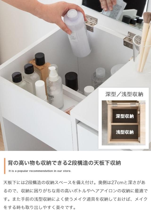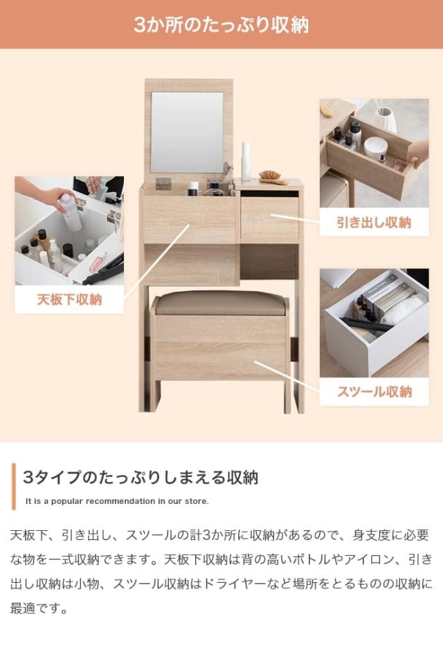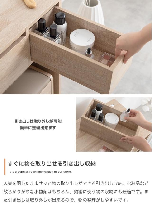 背の高いボトルやヘアアイロンも収納できる深さのある天板下収納、小物整理に便利な引き出し、そしてドライヤーなどを隠してしまえる大容量スツール収納。