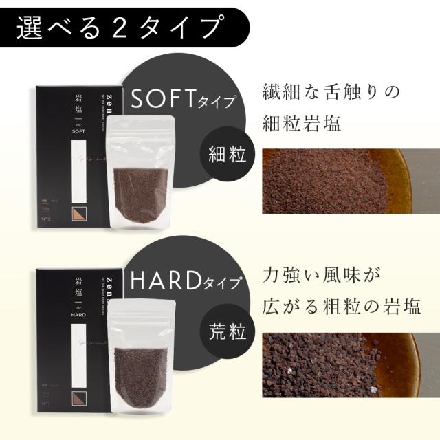 ひと舐めで、自然の力を取り入れる 毎日の習慣に。 繊細な舌触りの細粒岩塩(SOFT)と、力強い風味が広がる粗粒の岩塩(HARD)からお選びいただけます。 岩塩には体内のミネラルバランスを整える役割があります。 そのまま、またはお好みの料理にかけてお楽しみください。高血圧の方も安心、体に優しい新しい塩のカタチ。 |