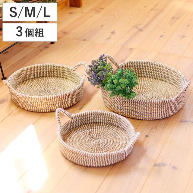 かご ラウンドバスケット S M L 3個組 持ち手 ( バスケット カゴ 収納 小物収納 シーグラス ハンドメイド 籠 小物ケース 収納バスケット トレー トレイ 水草 ナチュラル 手編み 手作り )