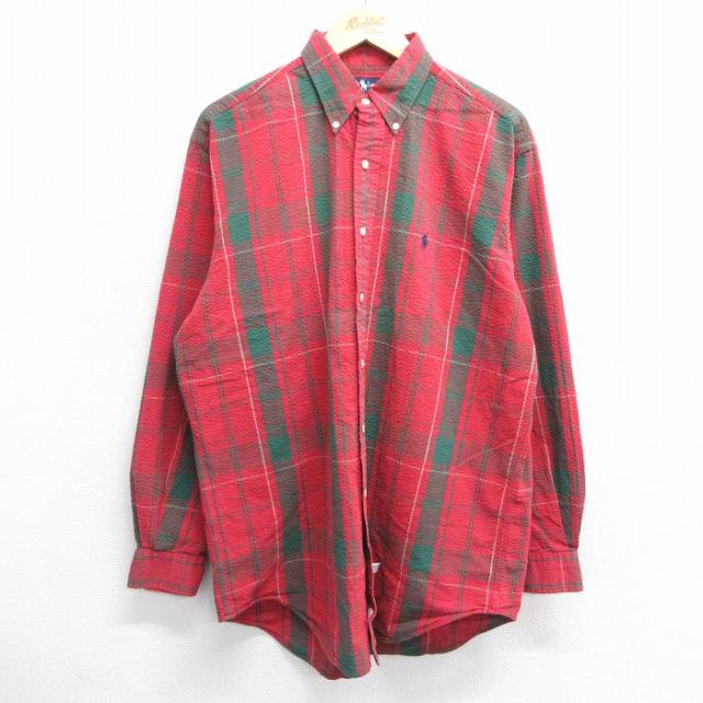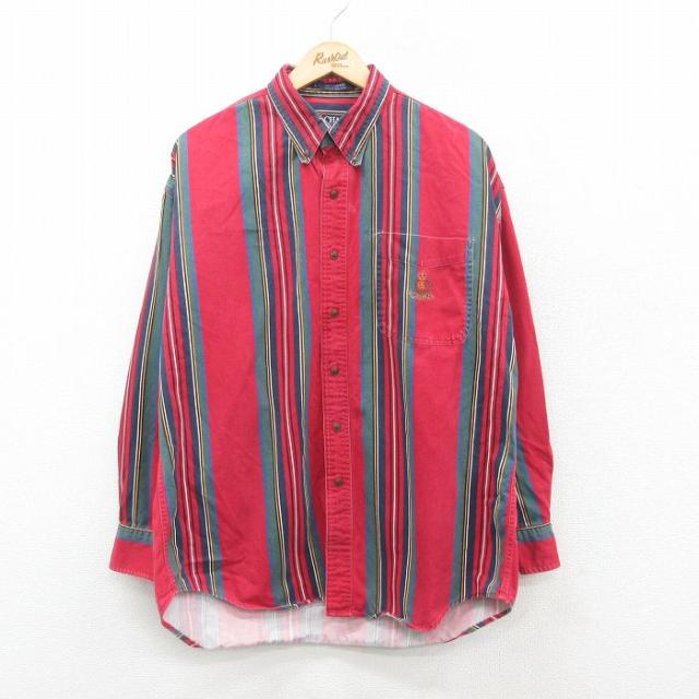 【商品名】 XL★古着 ラルフローレン チャップス 長袖 ブランド シャツ メンズ 80年代 80s ワンポイントロゴ マルチカラー ロング丈 コットン ボタンダウン 赤他