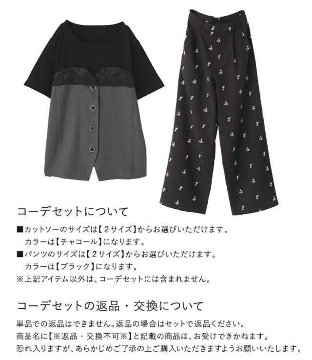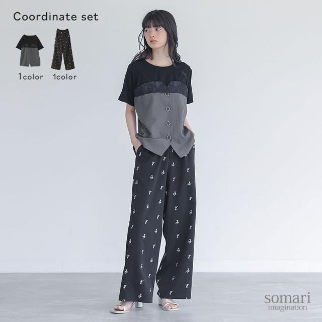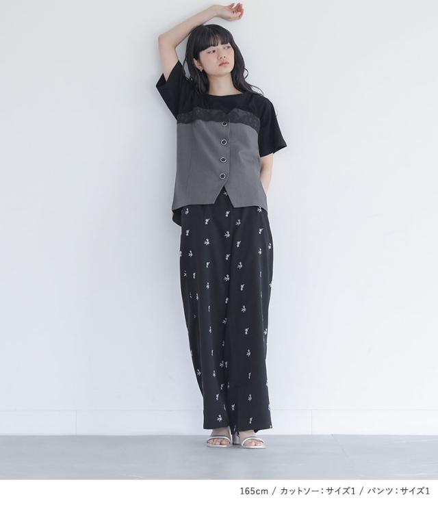 【送料無料】『ビスチェドッキングカットソー×花柄刺繍スラックスコーデ2点SET』【メール便不可】【20】[2点コーデセット 2025 レディース カットソー トップス Tシャツ 半袖 パンツ ボトムス スラックス 花柄]