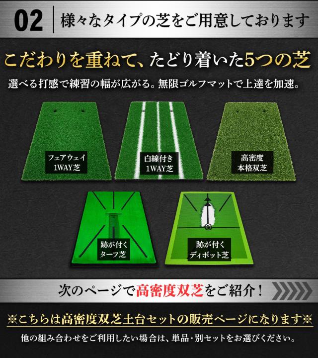 【使いやすい5種類の芝】練習しやすい芝のセットを5種類ご用意しました。用途やお好みに合わせてお選びください。また張り替え用の芝のみの単品販売も行っておりますので、カスタマイズ用や交換用としてご利用ください。